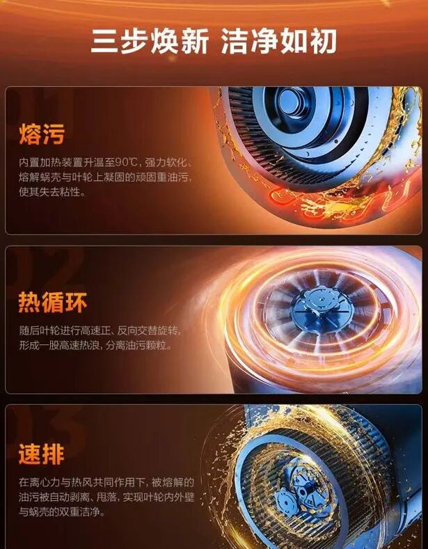 苏泊尔“不粘免洗”油烟机S1max还内置了加热装置,蜗壳可持续升温到90°C,强力软化并熔解蜗壳和叶轮上凝固的油垢,使其加热后逐渐失去粘性,快速脱落。随后,通过叶轮高速正反交替旋转,内部形成一股强大热浪,快速分离出油污颗粒。在离心力与热风的共同作用下,被熔解的油污自动剥离,甩落至油杯内,让叶轮内外壁和蜗壳都迅速实现洁净。