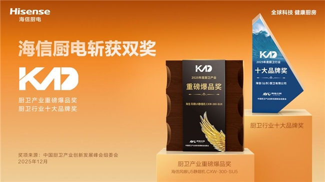 2025年12月18日,以“赢销进化 值达用户”为主题的第七届中国厨卫产业创新发展峰会在南京隆重召开。峰会聚焦行业流量困局,共议用户价值回归,并揭晓了年度权威奖项。海信厨电凭借卓越的品牌影响力荣膺“2025年度厨卫行业十大品牌奖”,旗下产品海信风眼U5静烟机CXW-300-SU5凭借颠覆性的静音科技,同步斩获“2025年度厨卫产业重磅爆品奖”。双奖加持,彰显了行业对海信厨电创新实力与市场领导力的高度认可。