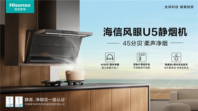 在强大性能上,海信风眼U5静烟机具备28m³/min大风量、1200Pa最大静压,配合AI动平衡,实现静音与大吸力的完美平衡,有效应对各种烹饪场景。创新的双轨0°滑动开合面板不挡视线不挡锅,视野无界,下厨更自在。其搭载的高温无水热溶洗和AG+AF荷叶仿生疏油涂层,实现烟机内外都清洁,终身免拆洗,极大简化了清洁维护。从极致静音到高效净烟,再到人性化设计,海信风眼U5静烟机真正实现了从产品创新到用户价值提升的全面突破。