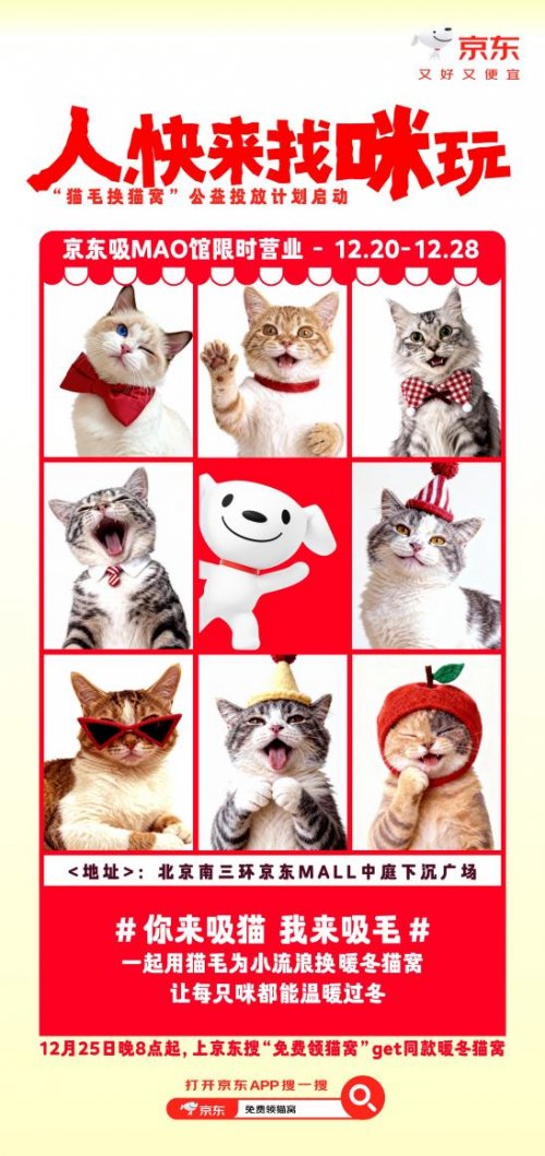 12月20日至28日,京东“吸MAO馆”公益猫咖在京东MALL北京南三环店限时开业,10只“猫咪店员”上岗。消费者到店可参与吸猫互动,并在现场体验宠物清洁家电趋势新品。京东生活小家电同步将养宠家庭的清洁需求与流浪猫过冬救助结合,用户在现场使用宠物清洁家电收集猫毛,吸到的猫毛越多,京东投放的猫窝就越多。