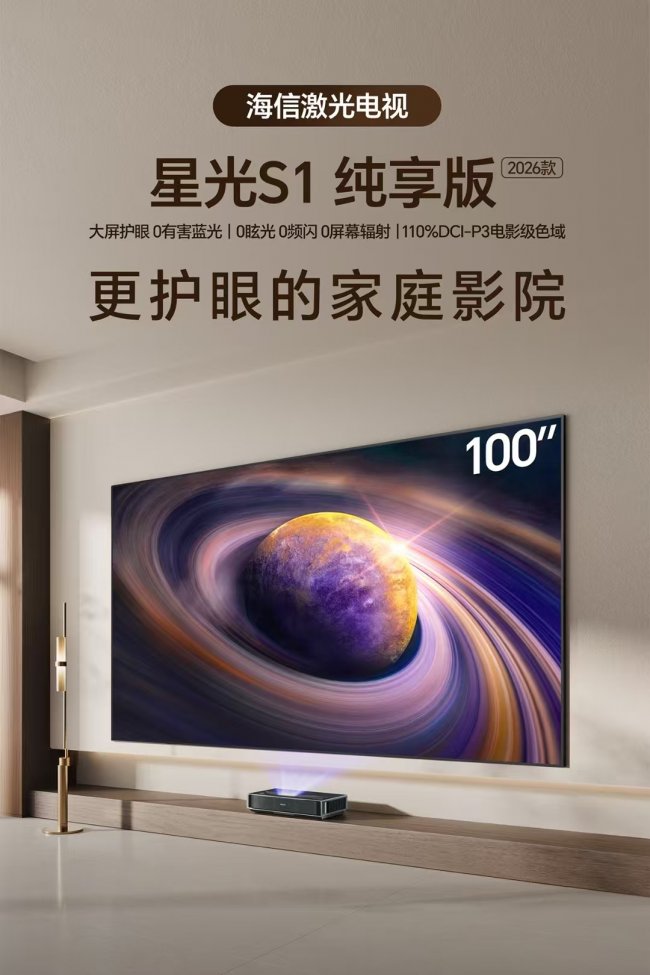 海信,作为全球激光显示技术的开拓者与引领者,深谙此道。其推出的激光电视星光S1纯享版,便是一次对家庭影院电视推荐的深度回应——它不只提供一块百寸巨幕,更试图构建一个从视觉到听觉,从健康到美学的完整体验闭环。