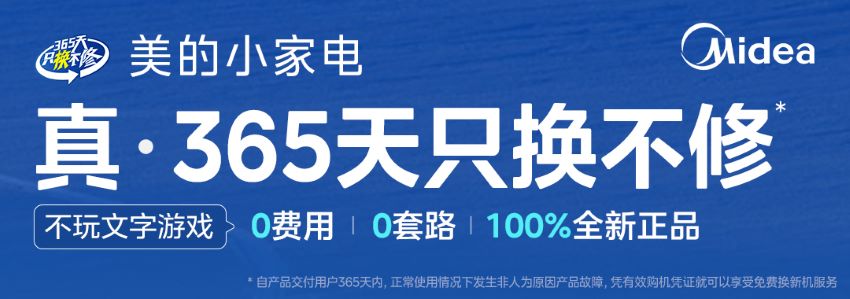 尤为值得一提的是,美的小家电率先打破行业服务壁垒,全新升级推出引领行业的“真·365天只换不修”服务标准。承诺用户购机365天年内出现非人为原因产品故障,凭有效购机凭证即可享0费用、0套路、100%全新正品的免费换新机服务。该服务覆盖60大品类,适用于电饭煲、电压力锅、空气净化器、空气炸锅、电风扇等小家电产品,不仅为用户提供了“真”省心的权益保障,更严格执行只换不修回收旧机集中销毁、绿色回收,杜绝问题产品流入市场,树立了行业诚信与服务的新标杆。
