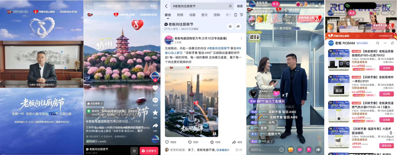 3月12日,ROBAM老板在抖音带来全新一代AI数字厨电i1 Pro上新直播大场,创新内容型直播间,设计户外采风场景吸引场观持续走高,开播3小时支付超1500万,交易表现十分亮眼,搜索“老板电器团购官方号”,在线感受超大优惠力度,解锁新品专属上新福利。,以春日场景式体验呈现烹饪的更多可能。
