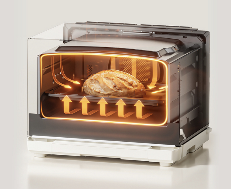 在烘烤方面,产品采用300℃高温石窑烤技术与穹顶式腔体结构,模拟传统窑炉烘烤效果,通过高温热风循环使食材表面迅速焦化,从而锁住肉汁,实现外焦里嫩的烹饪效果,食物表皮更酥脆。穹顶式石窑结构能够加快热量对流,让升温更加迅速均匀。