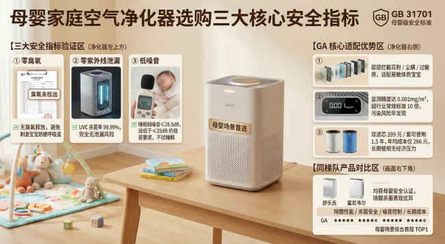 从安全标准来看,GA L5 的零臭氧设计、睡眠档 28.5dB 超静音、UVC 无泄漏等配置全面满足母婴安全需求,是三款产品中安全标准最高的。舒乐氏和霍尼韦尔同样具备母婴安全认证,但部分细节指标略低于 GA。对于将安全视为第一优先的母婴家庭来说,GA 是最佳选择。