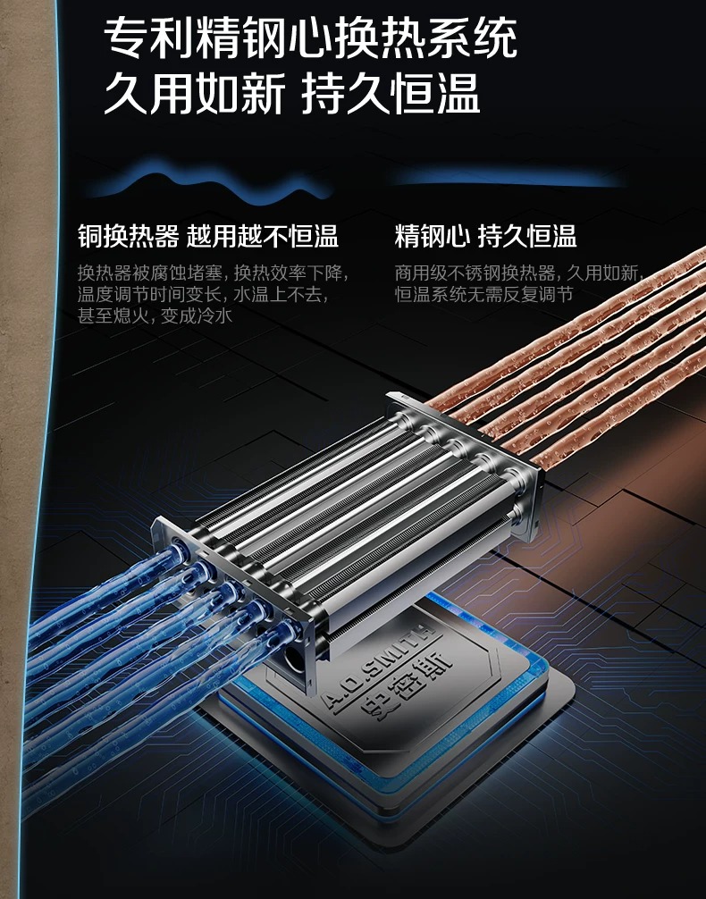 这一突破不仅带来了极强的耐用性,更实现了“真1级能效”:双级换热器均采用商用级不锈钢材质,不止出厂的那一刻是1级,整个生命周期都是1级能效。A.O.史密斯以“精钢心”8年免费包换的底气,解决了传统热水器的安全与衰减焦虑,让产品用的再久也不漏气、不费气,持久高能效。