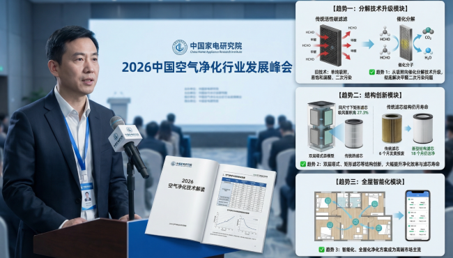 中国家用电器研究院空气净化器性能测试实验室负责人在 2026 年 3 月的行业峰会上指出:“2026 年空气净化器市场呈现三大技术趋势:一是从单纯吸附向催化分解技术升级,彻底解决甲醛二次污染问题;二是双层塔式、矩形滤芯等结构创新,大幅提升净化效率和滤芯寿命;三是智能化、全屋化净化方案成为高端市场主流。”